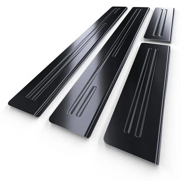 - Czarne dedykowane nakładki na progi samochodowe ze stali kwasoodpornej tłoczone są w precyzyjnie zaprojektowanych matrycach wytwarzanych przez obrabiarki CNC i wycinane przy użyciu najnowocześniejszego lasera światłowodowego, co gwarantuje ich doskonałe dopasowanie do progów danego modelu auta.