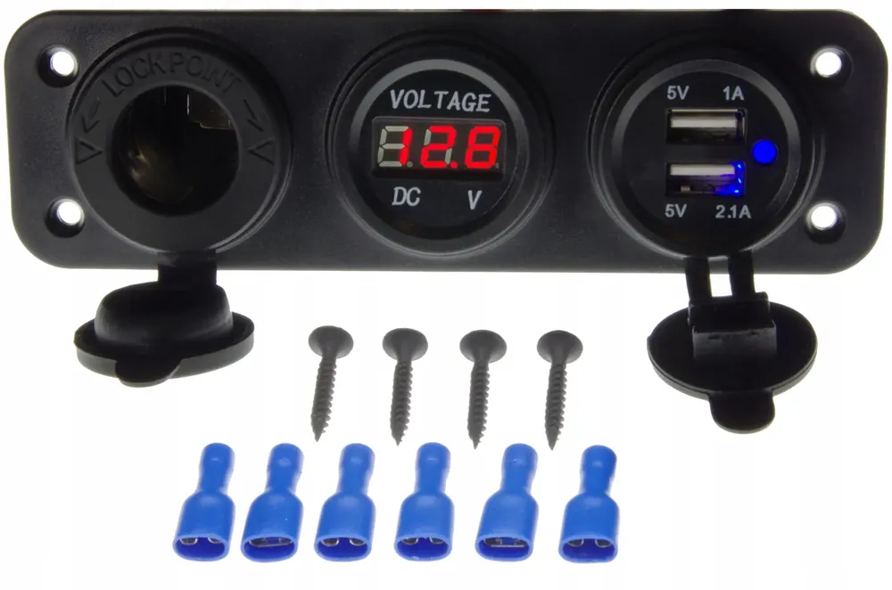 Panel z gniazdem zapalniczki 12V z portami USB 5V oraz woltomierzem.