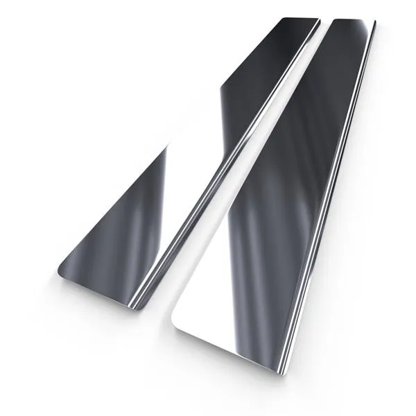 - Srebrne dedykowane nakładki na progi samochodowe ze stali kwasoodpornej tłoczone są w precyzyjnie zaprojektowanych matrycach wytwarzanych przez obrabiarki CNC i wycinane przy użyciu najnowocześniejszego lasera światłowodowego, co gwarantuje ich doskonałe dopasowanie do progów danego modelu auta.